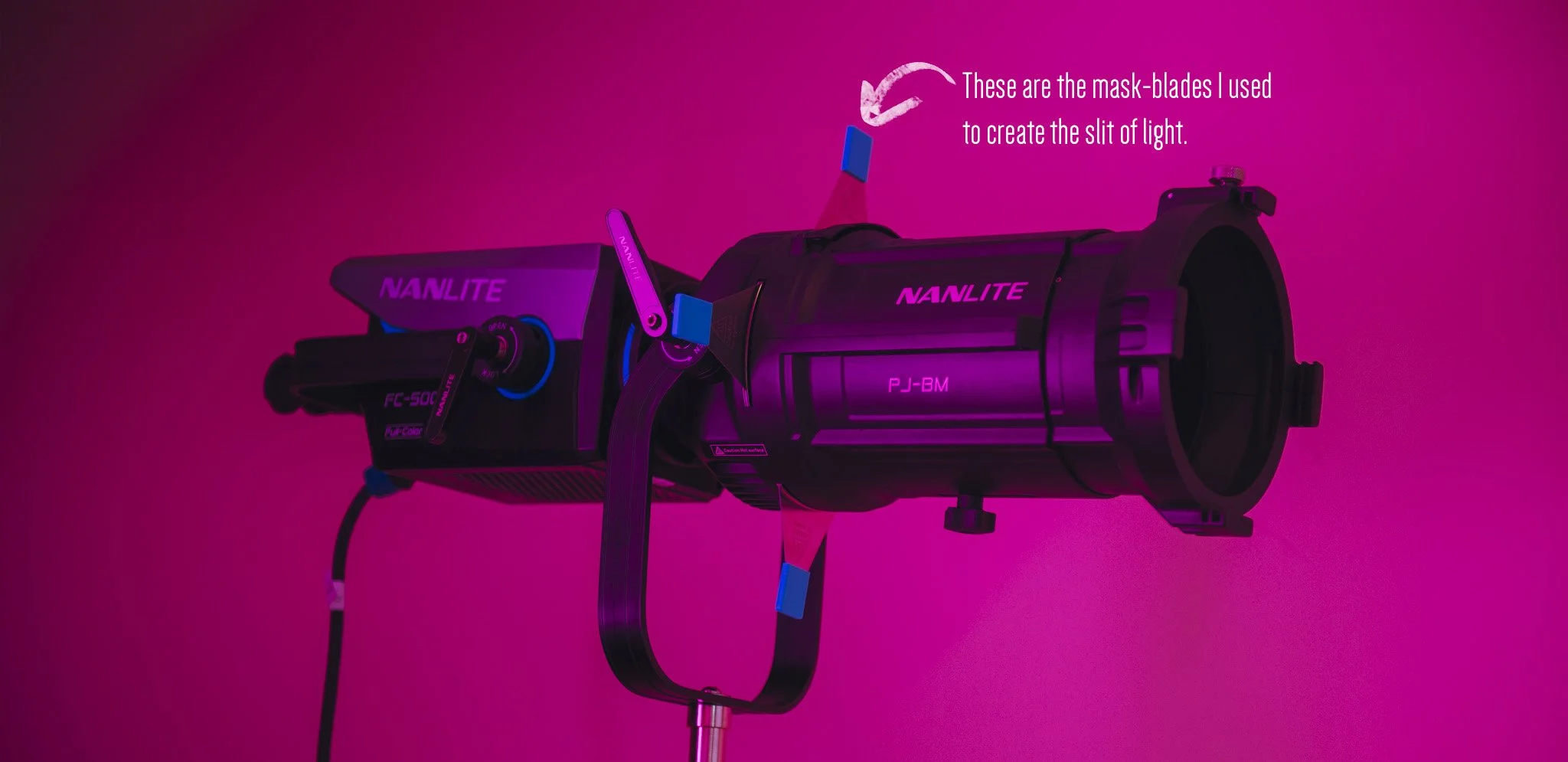 The other major difference, of course, is the fact that I've now added a Protection Attachment to the FC-500C. I’ve then positioned the blades of the mask from the Projection Attachment to make a horizontal slit of light on the wall low and behind the model. It’s this slit of light that will play our hue-loop.