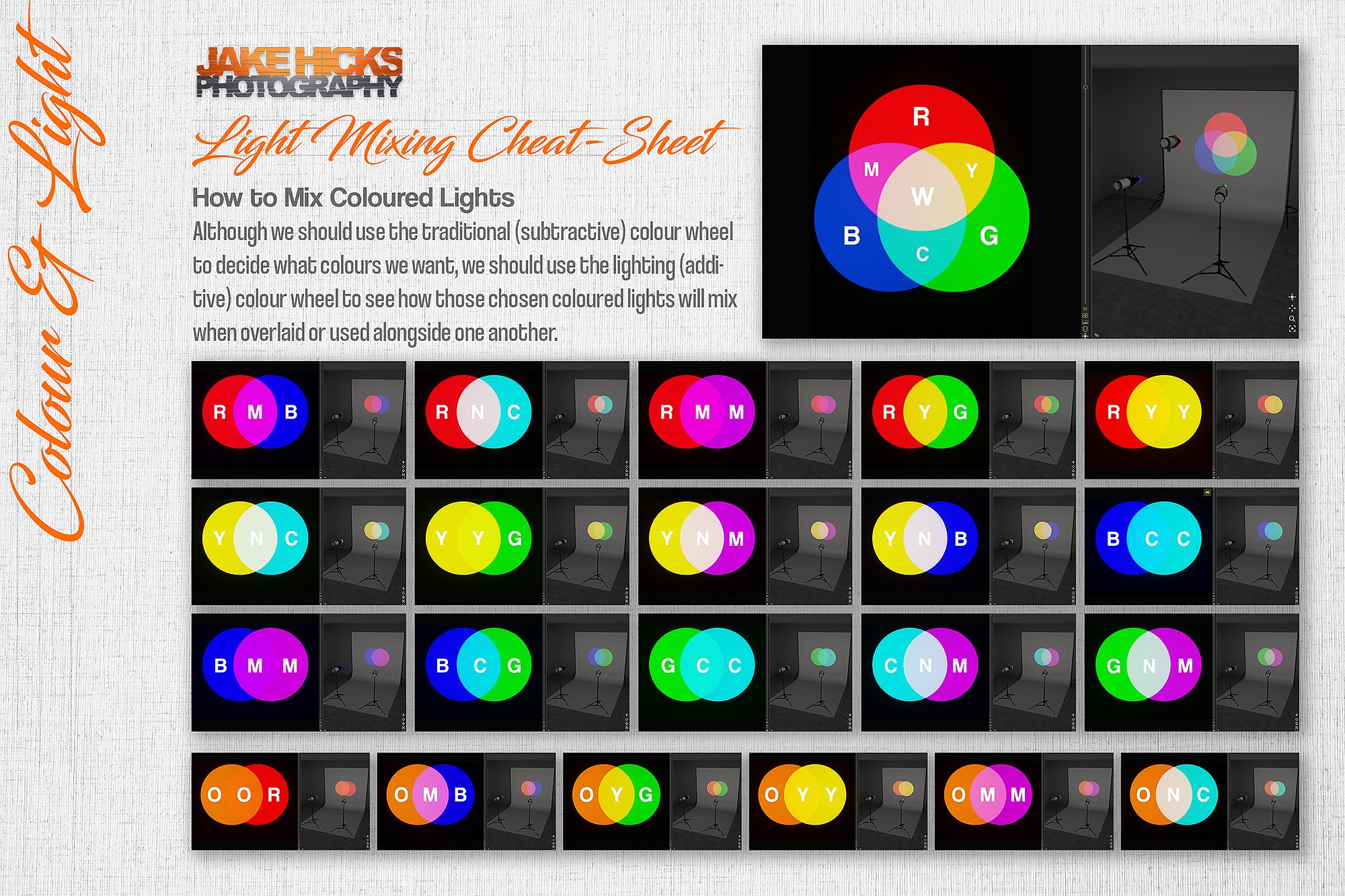This is clearly a substantial topic and one that I've been learning/fighting with for many, many years. What I'm sharing with you today is a simple coloured light mixing cheat-sheet. This is actually just one page from my new courses workbook and that book is currently at about 40+ pages already with plenty more to go!